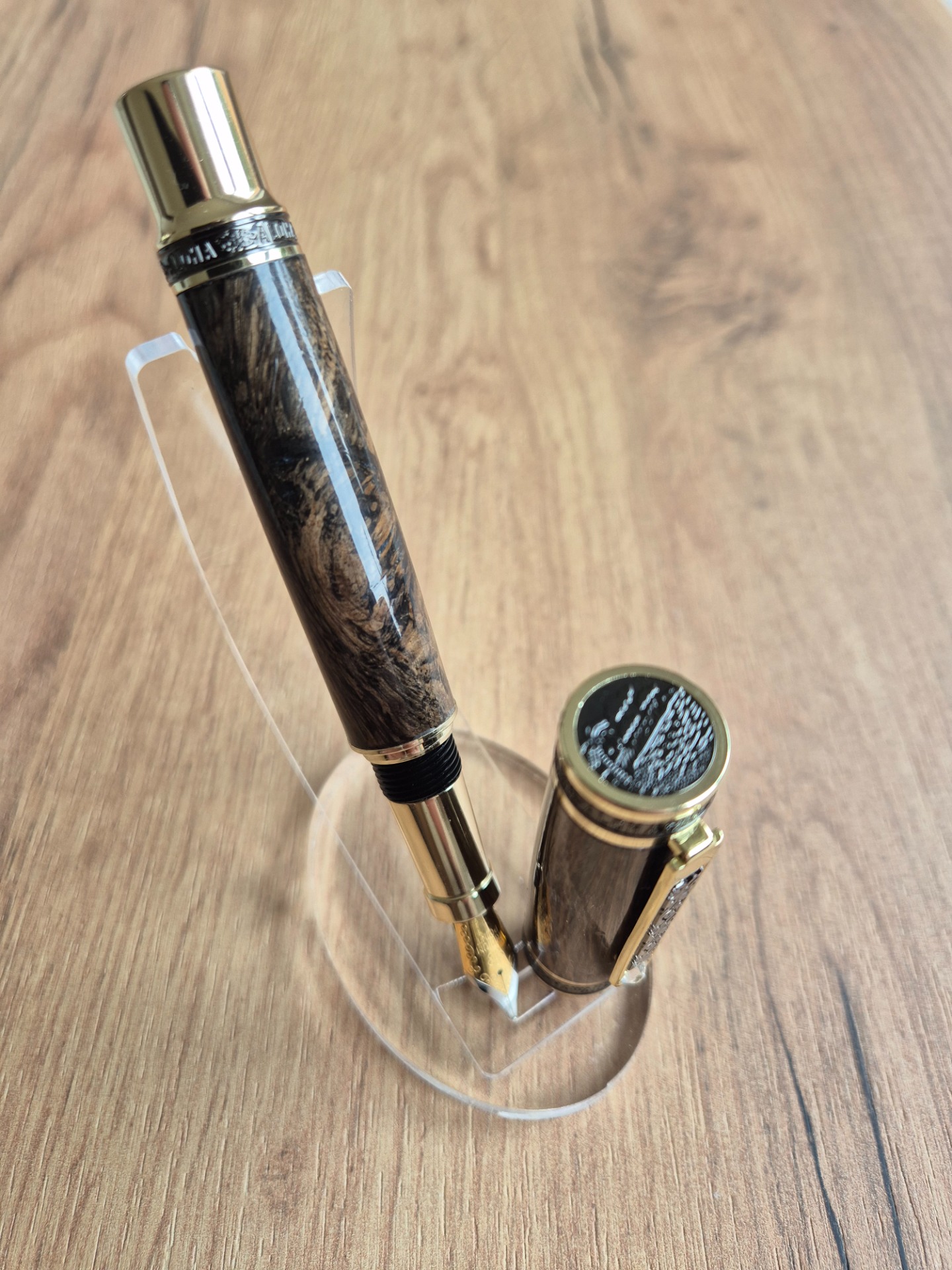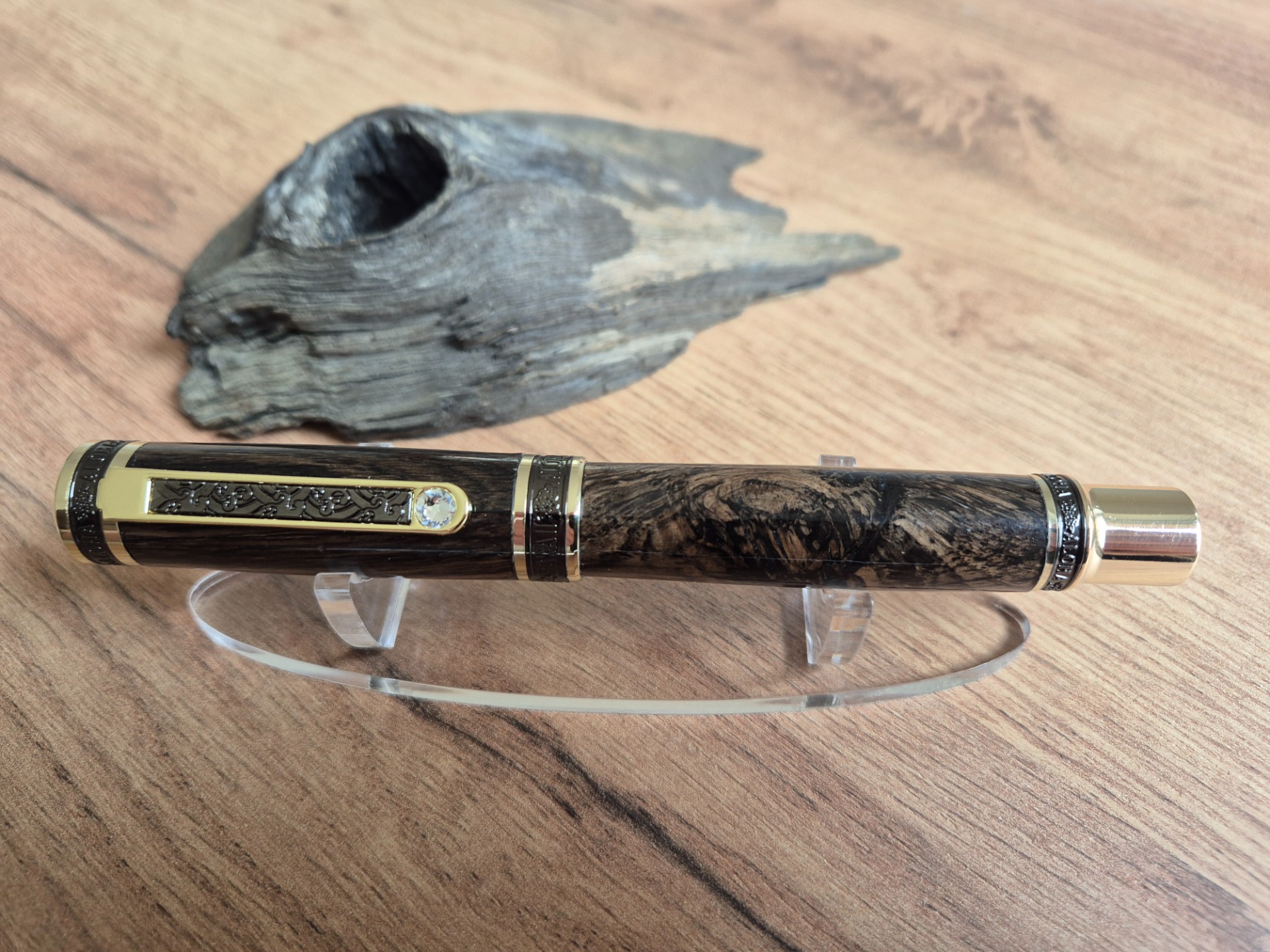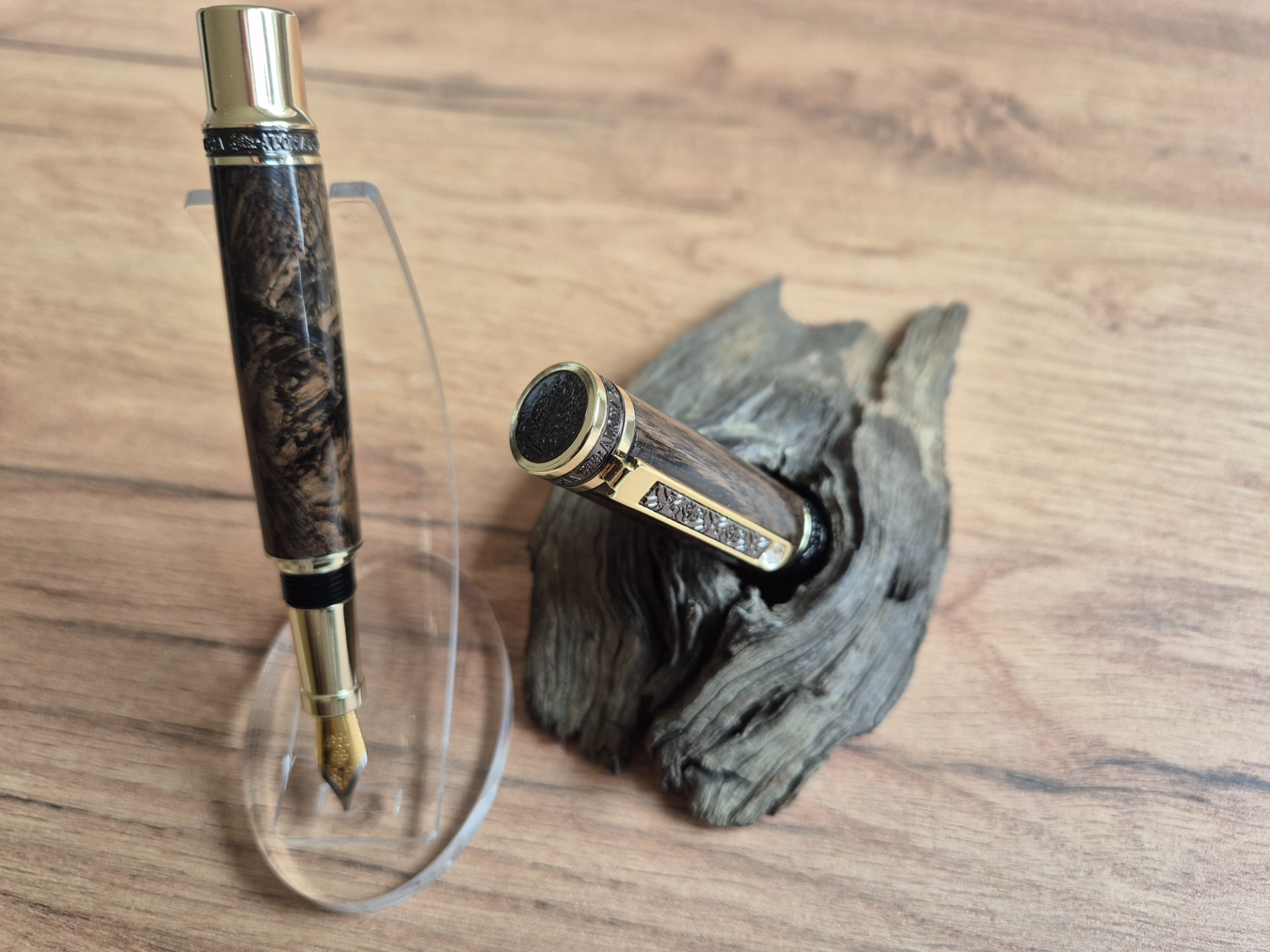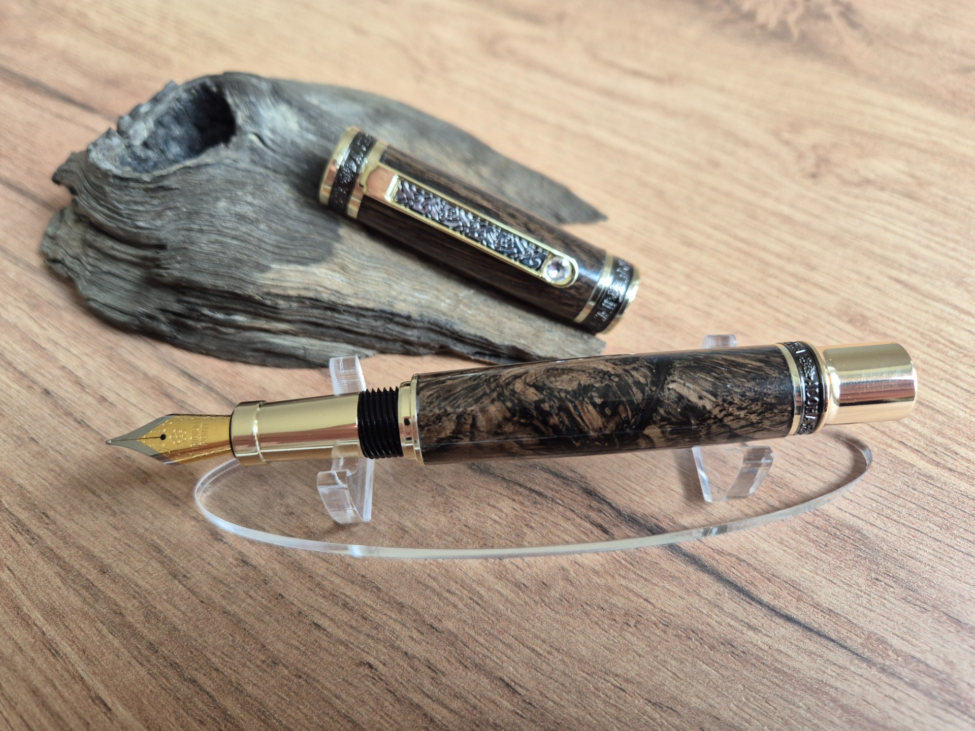 Toto luxusní plnící pero je vyrobeno ze subfosilního dubu starého přibližně 4000 let – materiálu, který byl po staletí uchován v přírodních podmínkách bez přístupu vzduchu, čímž získal svou charakteristickou tmavou kresbu, mimořádnou tvrdost a neopakovatelný vzhled. Každý kus je originál, nesoucí v sobě příběh dávných časů.