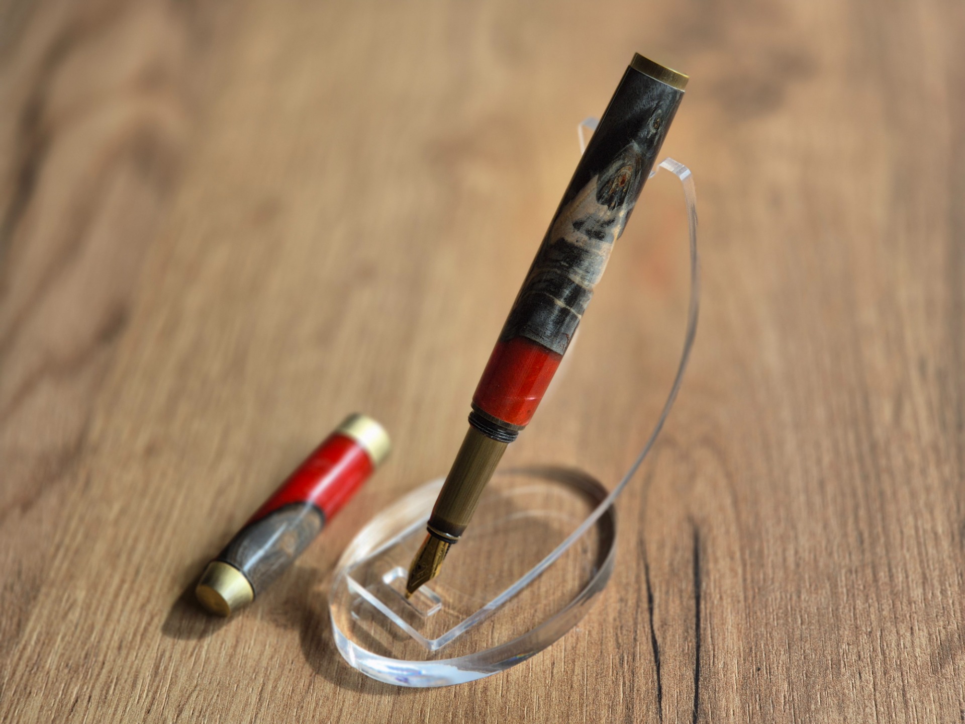 Toto luxusní plnící pero je výjimečným spojením stabilizovaného dřeva a epoxidové pryskyřice, které dohromady vytvářejí fascinující hru barev a struktur. Kontrast hlubokých přírodních tónů se živými odstíny červené dodává peru jedinečný charakter – každý kus je naprostý originál, který nelze zopakovat.