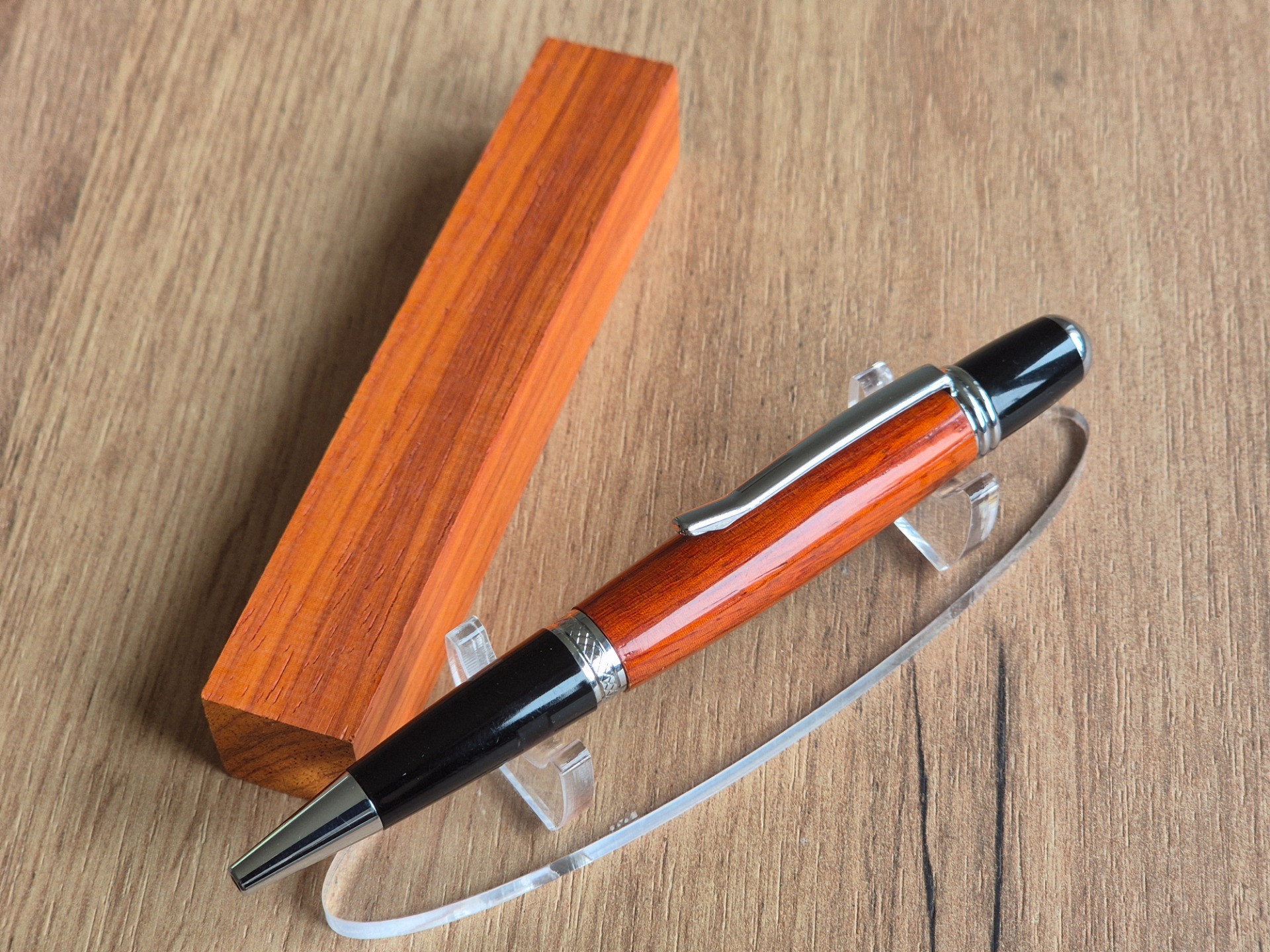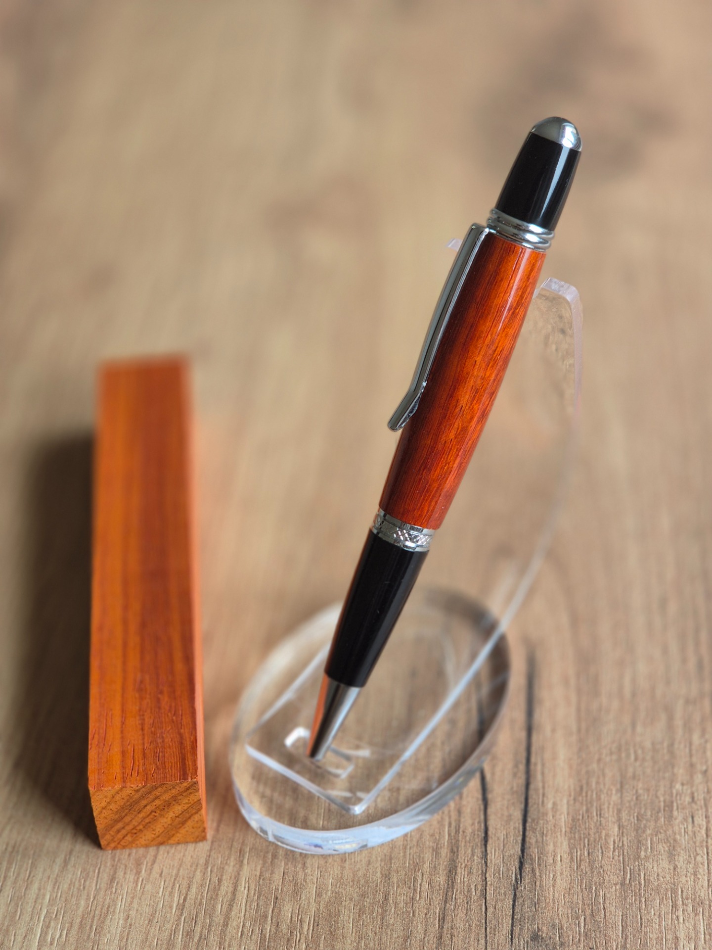 Dopřejte si jedinečný zážitek z psaní s touto ručně zpracovanou propiskou vyrobenou z exotického dřeva padouk. Toto vzácné dřevo vyniká svou sytě červenooranžovou barvou, která časem získává hlubší, ušlechtilý odstín a dodává každému kusu nezaměnitelný charakter.